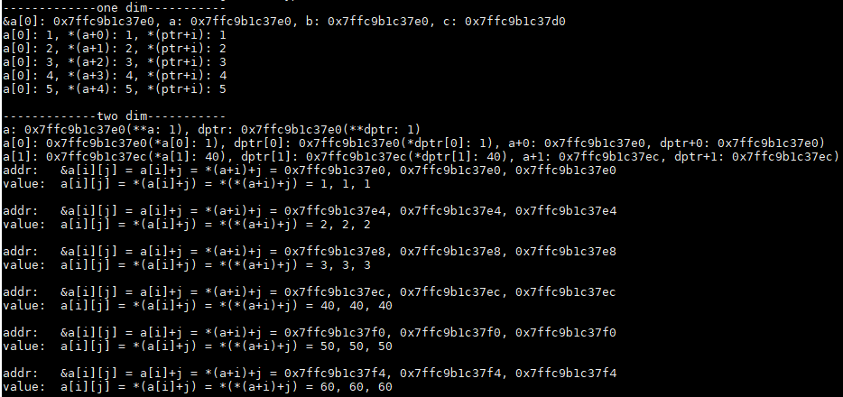 printf("addr: &a[i][j] = a[i]+j = *(a+i)+j = %p, %p, %p\n", &a[i][j], a[i]+j, *(a+i)+j);